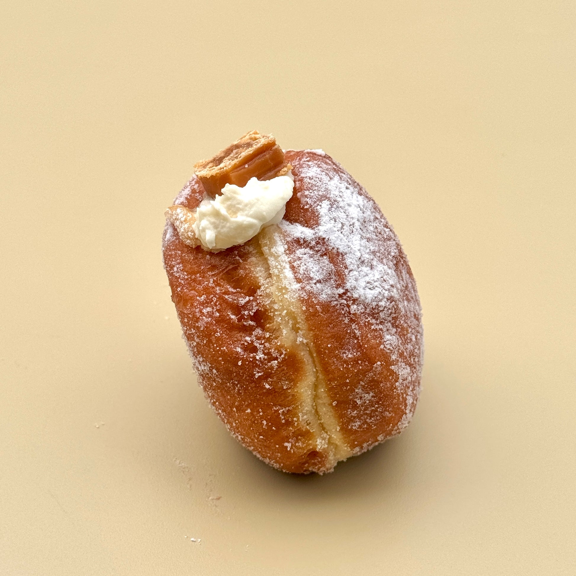 Kobliha plněná krémem z Baileys zdobená šlehačkou a karamelkou.