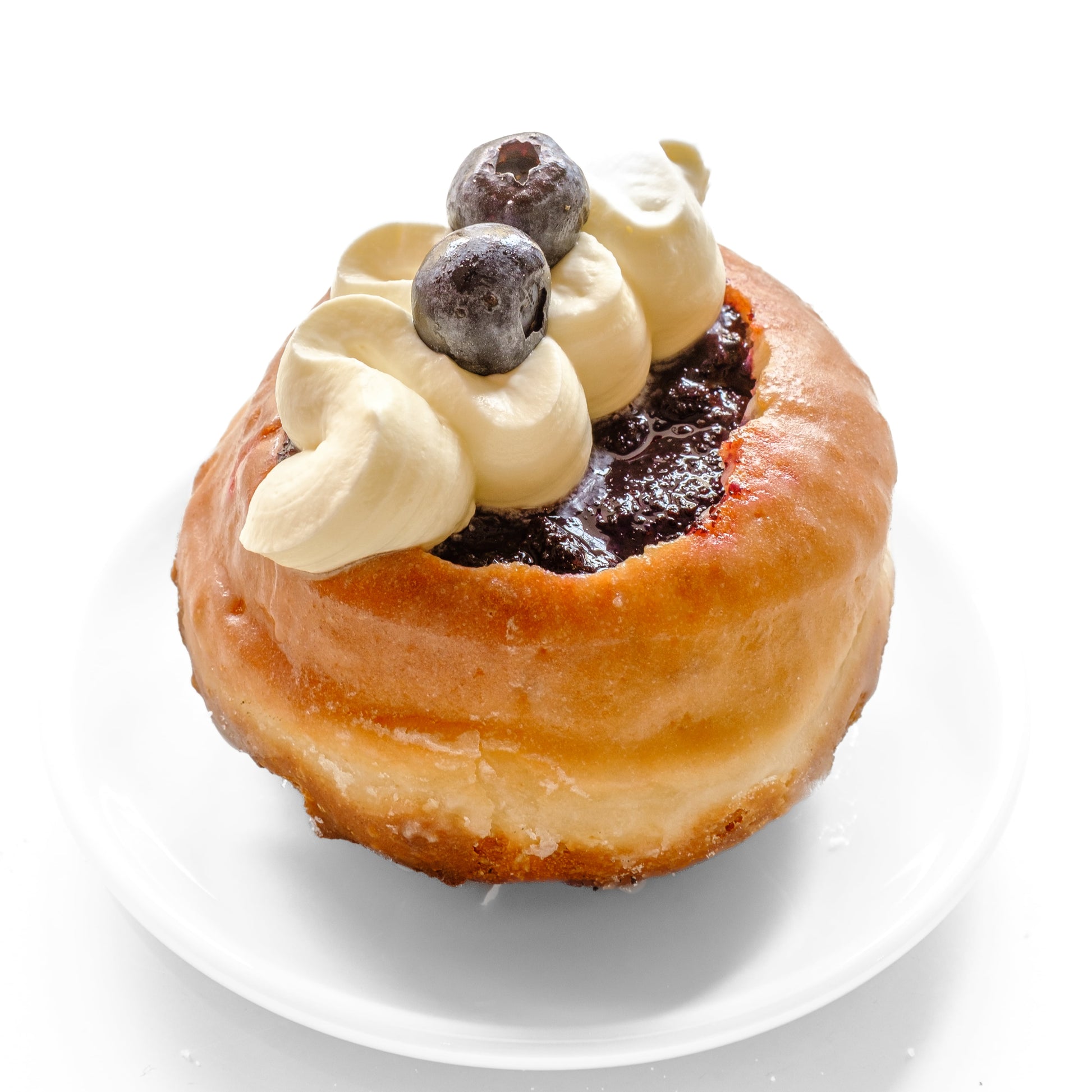 Kobliha s citronovou polevou plněná borůvkami vařenými s mákem zdobená vlnkou šlehačkového mascarpone a čerstvými borůvkami.