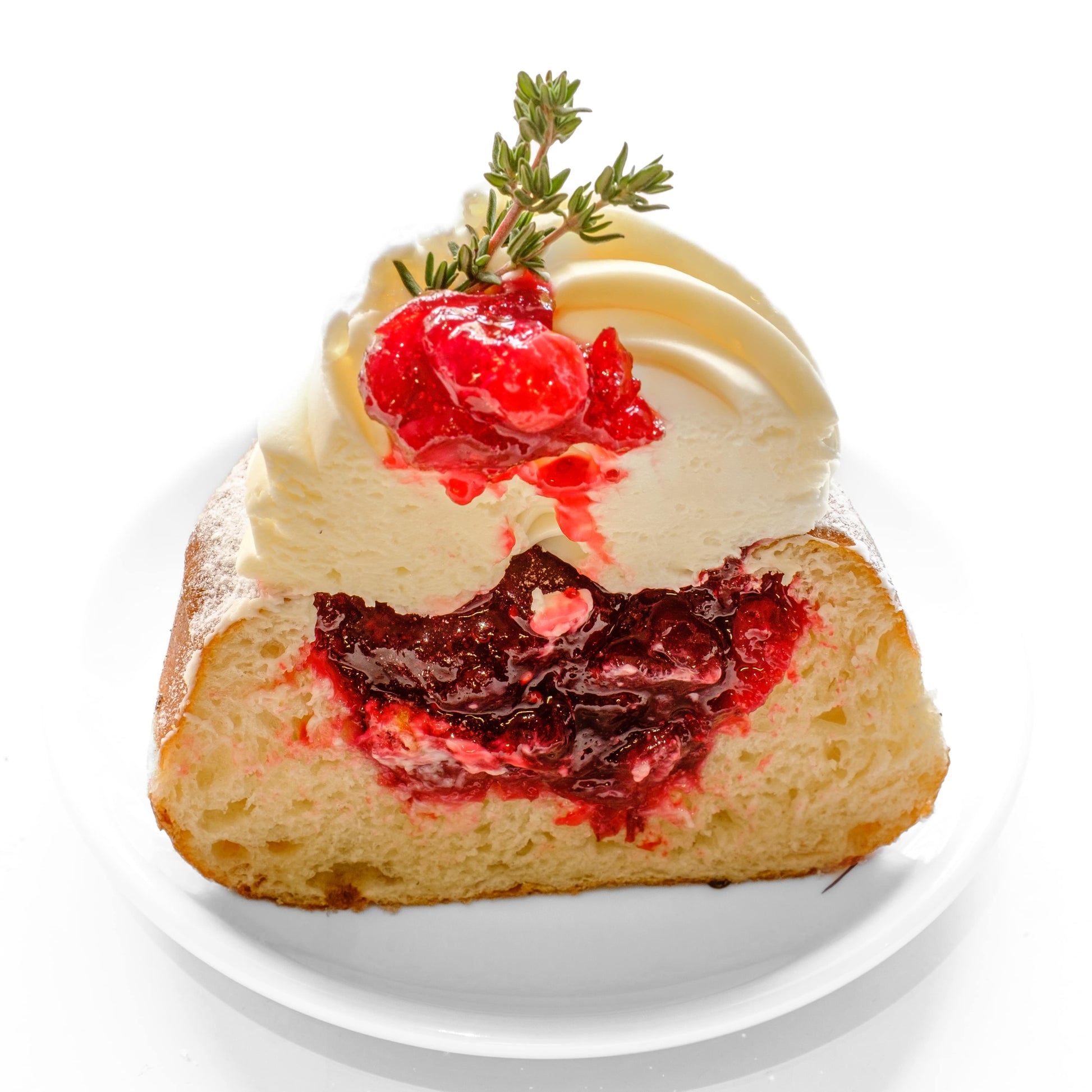 Kobliha inspirovaná Michalovým oblíbeným receptem z New York Times plněná brusinkovým rozvarem a zdobená citronovou šlehanou ganache z bílé čokolády a snítkou citronového tymiánu.