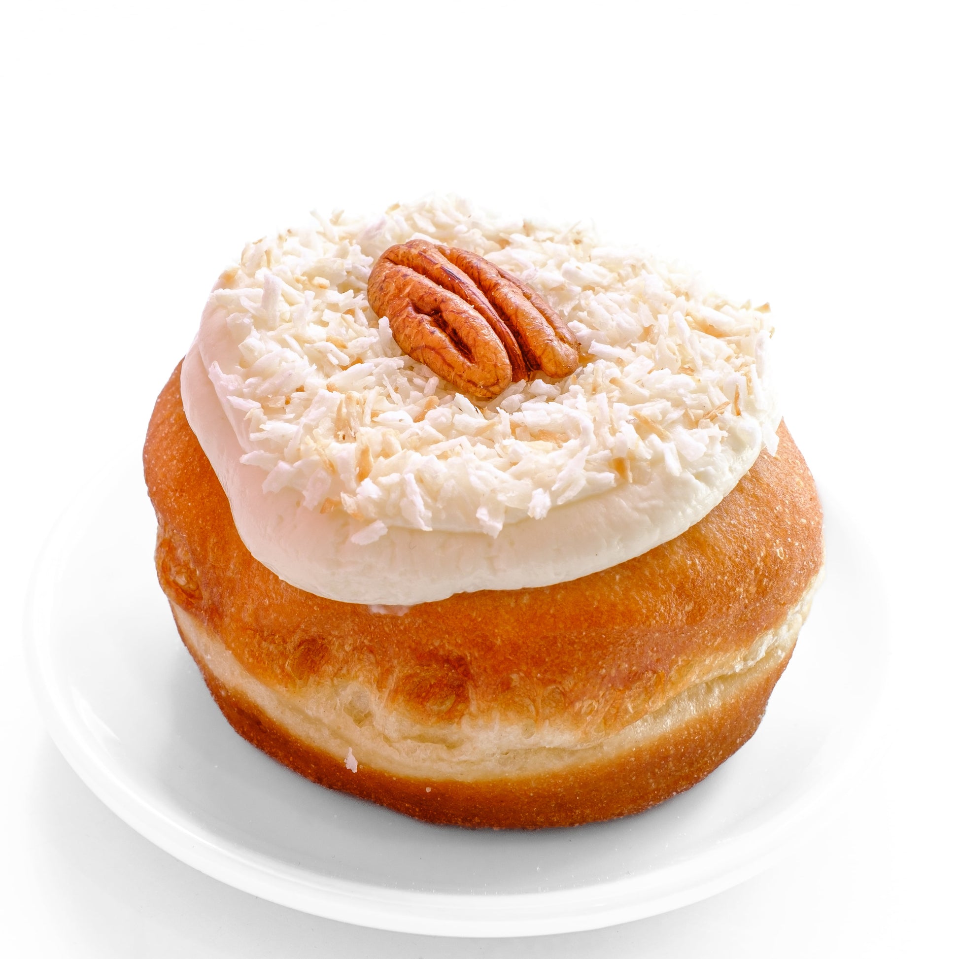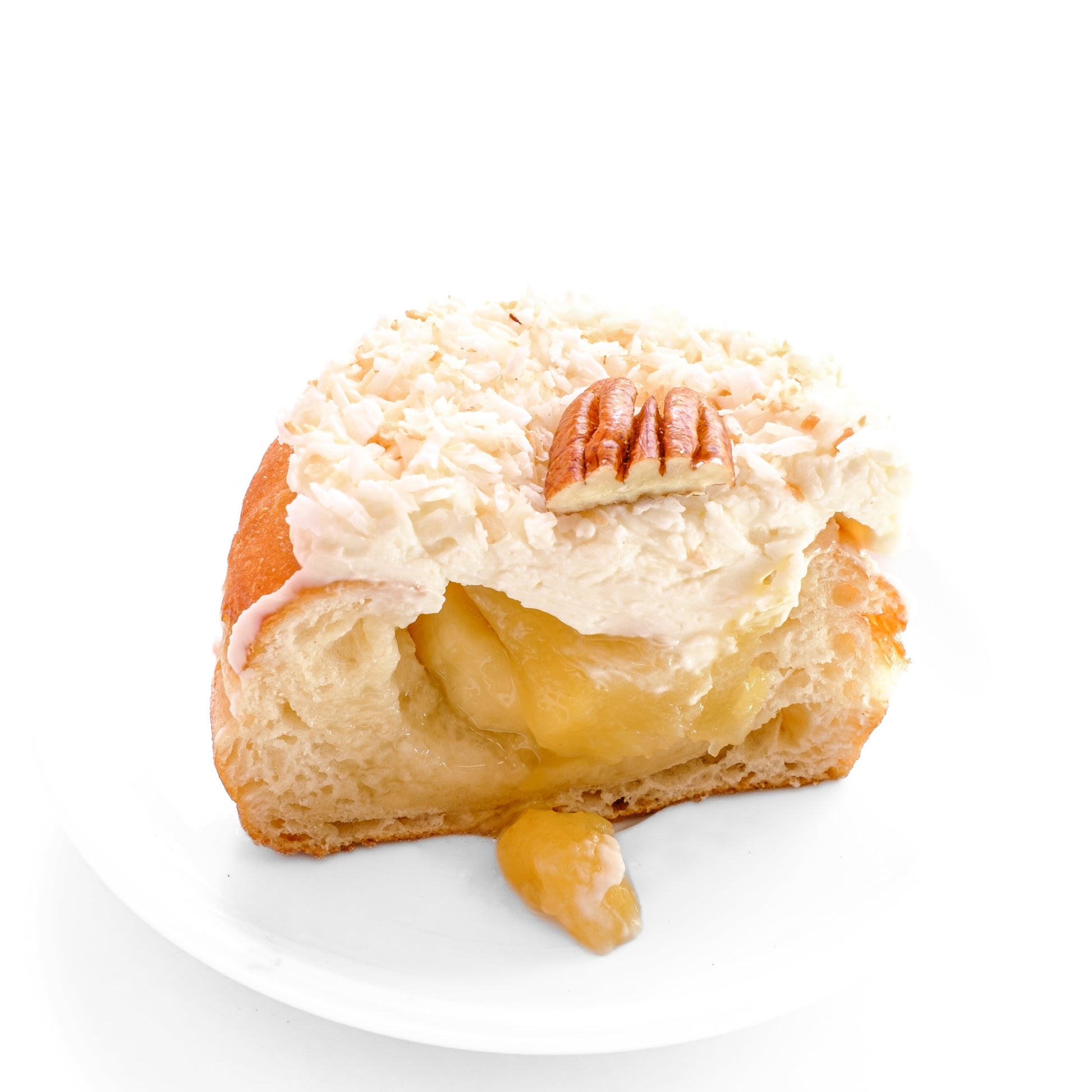 Kobliha inspirovaná americkým jižanským dezertem plněná čerstvými banány a ananasovým rozvarem zdobená cream cheese frosting, pekany a praženým kokosem.