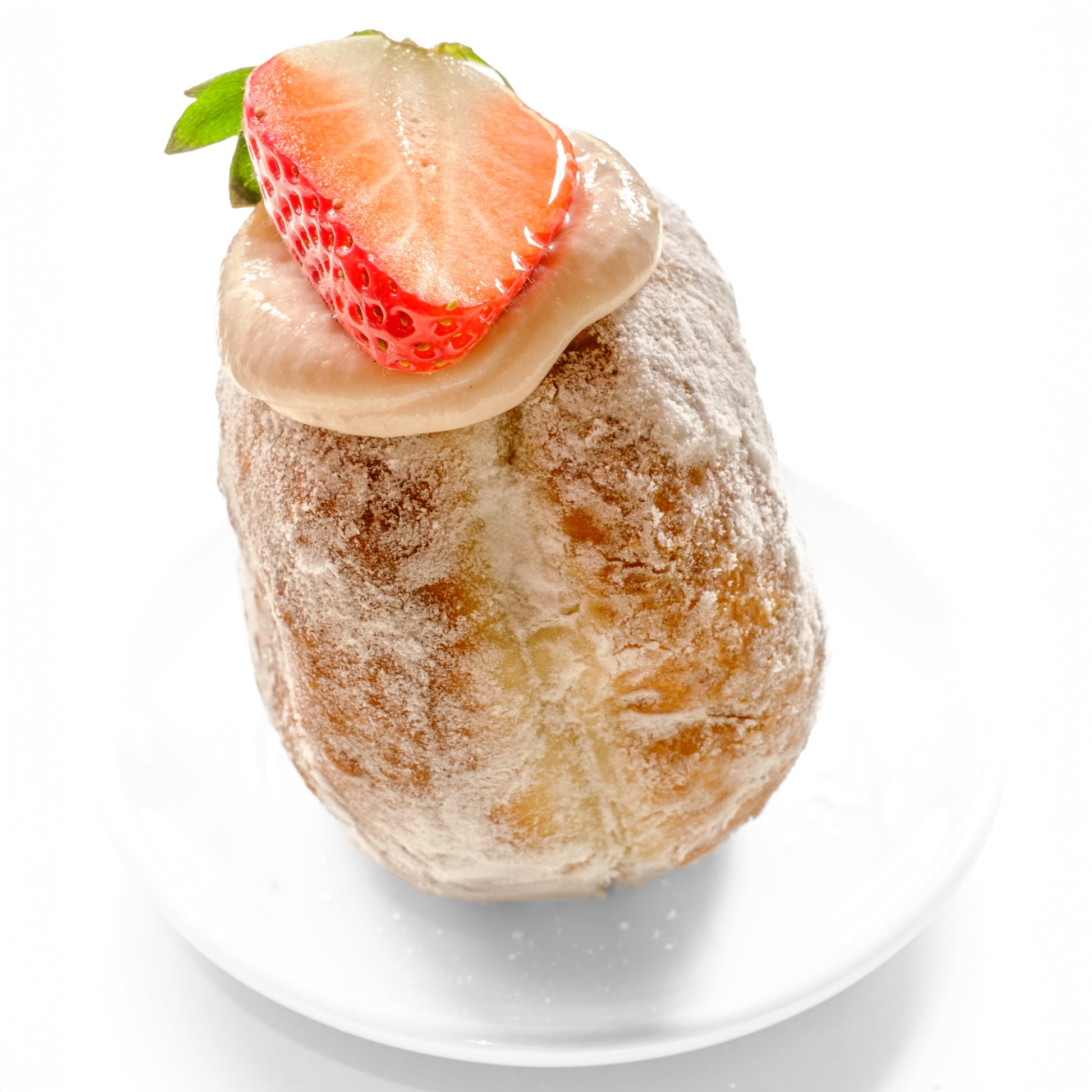 Kobliha plněná jahodovým cheesecakovým krémem s mascarpone s čerstvou jahodou.
