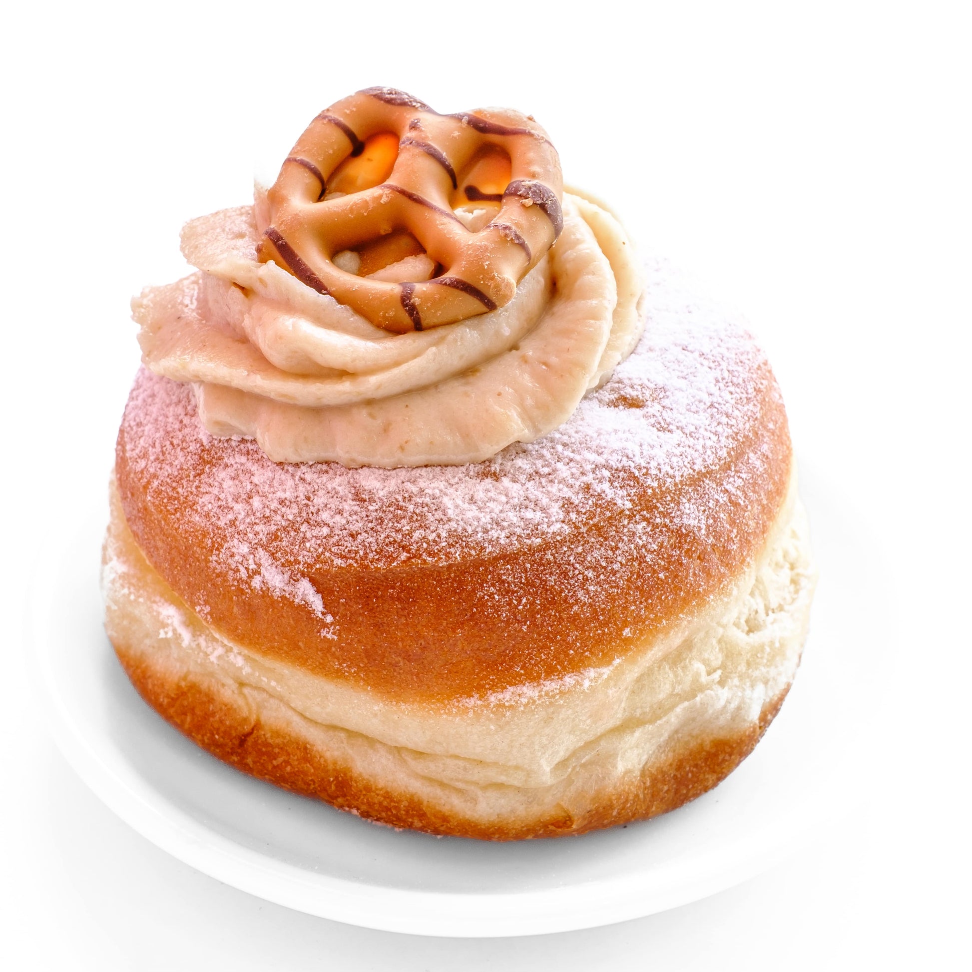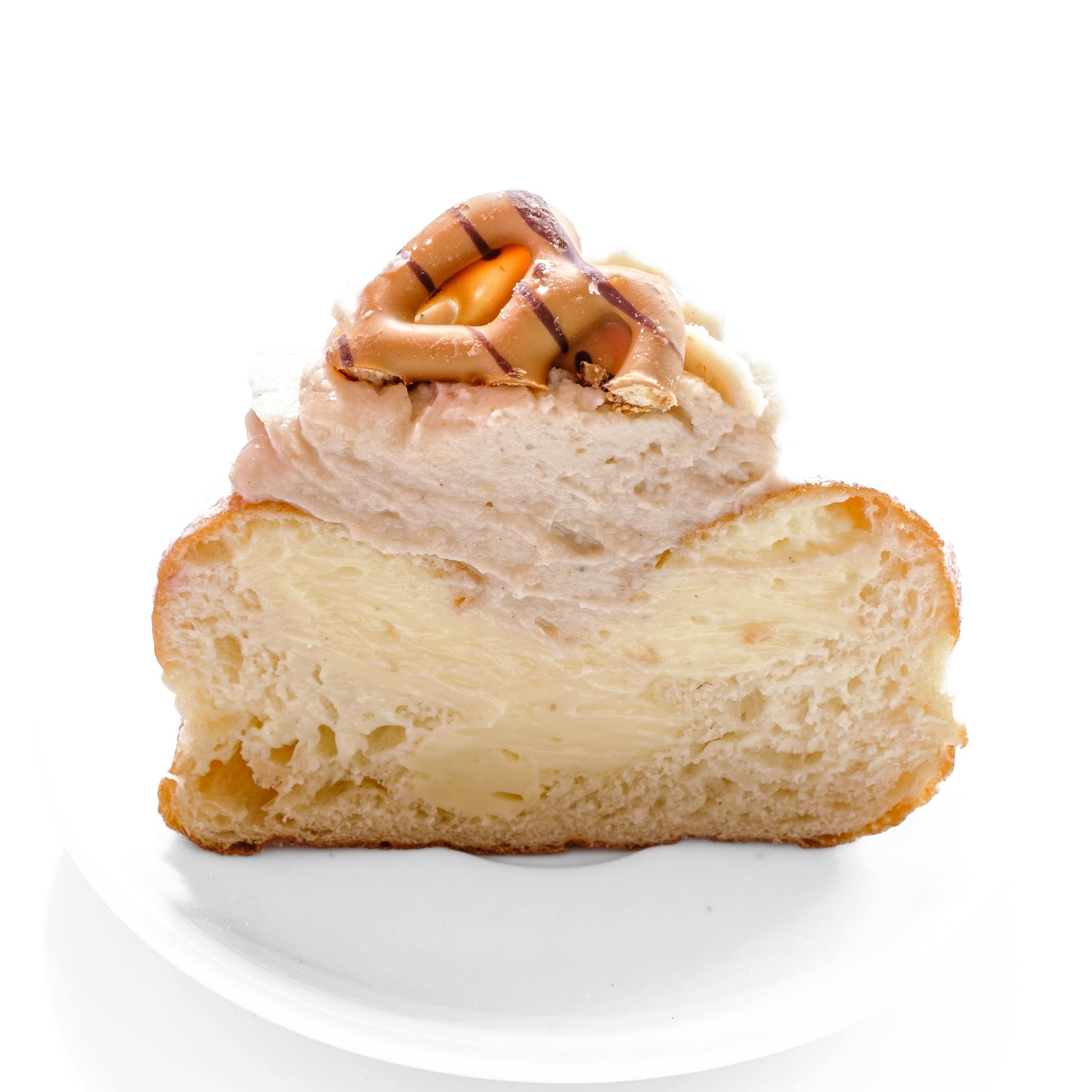 Kobliha shora plněná vanilkovým krémem a kaštanovým cheesecakovým krémem.