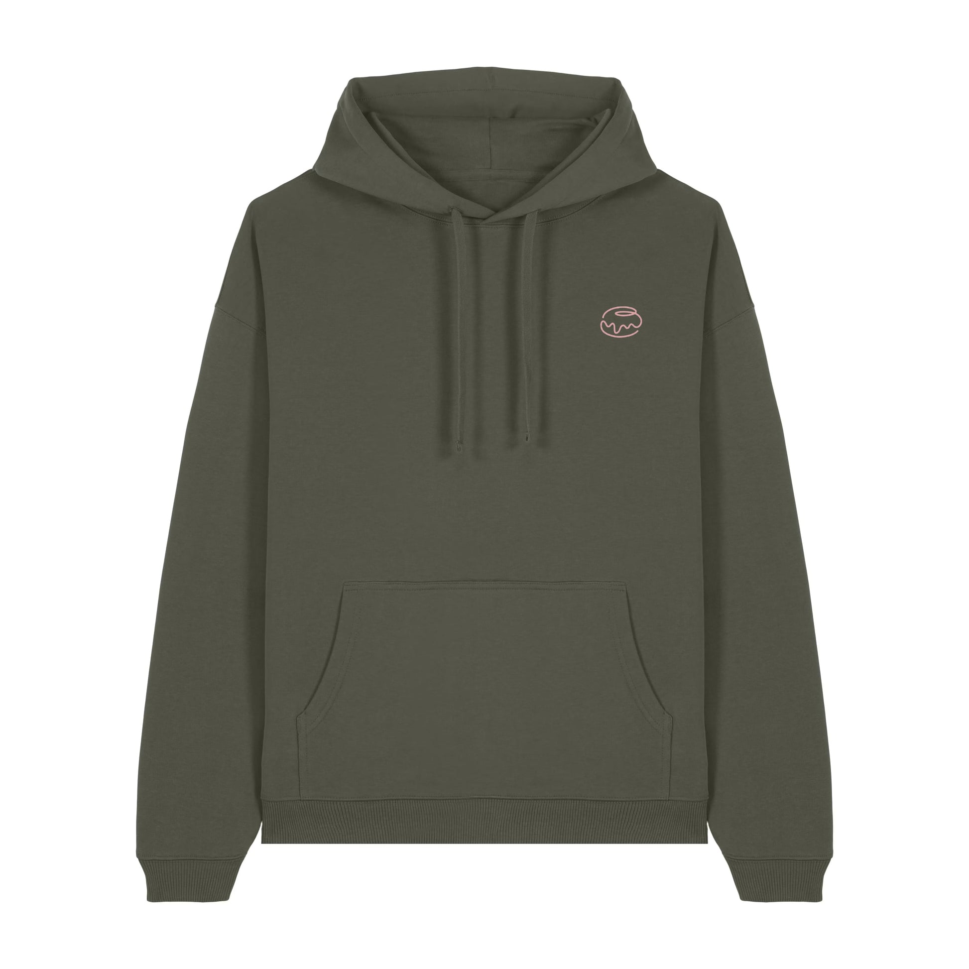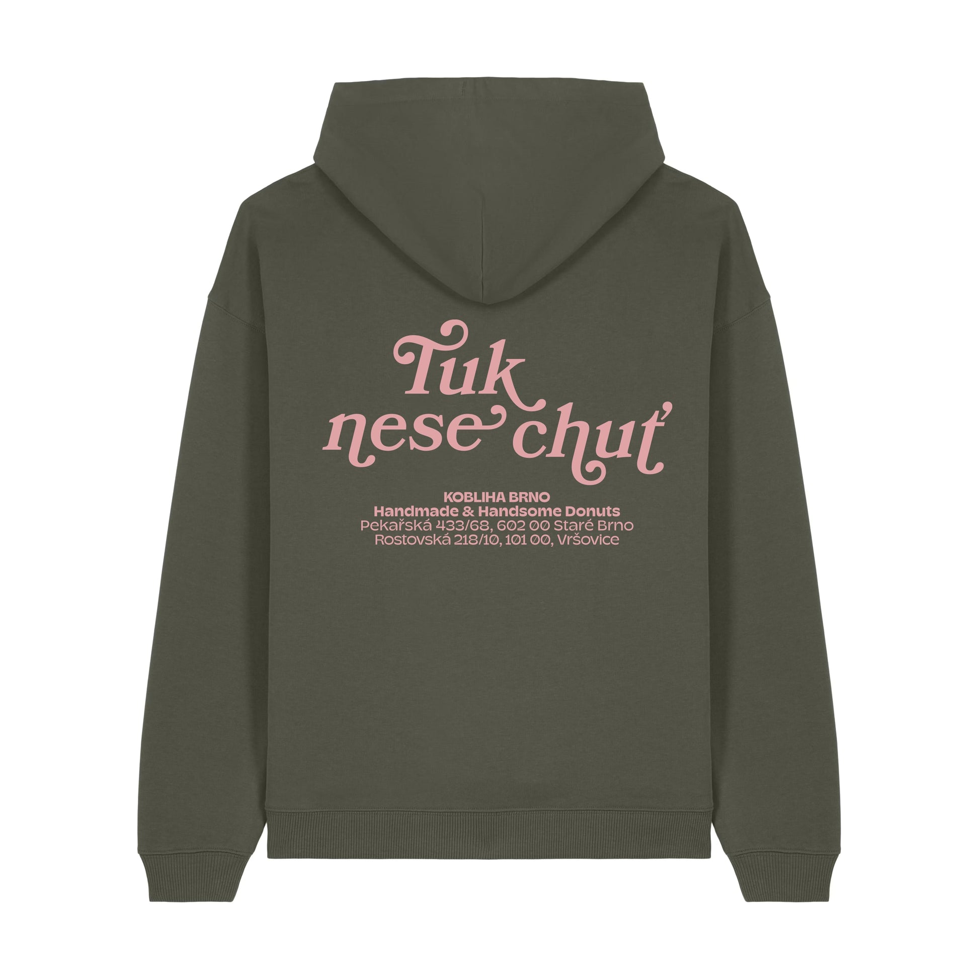 Koblihová hoodie s nápisem „Tuk nese chuť“. Organická bavlna v barvě Khaki Green s růžovým potiskem a střihem oversized.