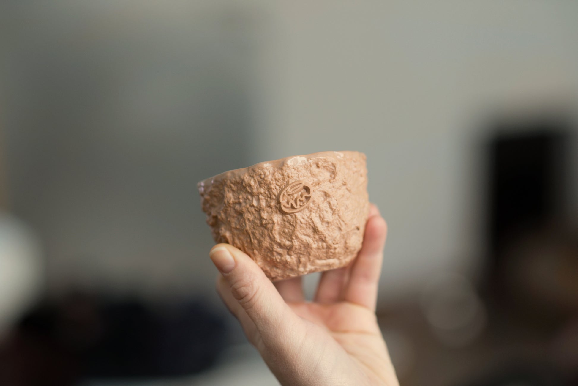 Keramický šálek od studia P3L1 z kolekce STONE AGE o objemu 280 ml v naší barvě peach beige s plastickým koblihovým logem.
