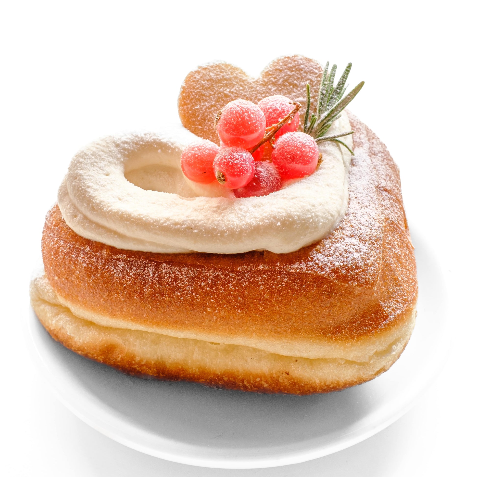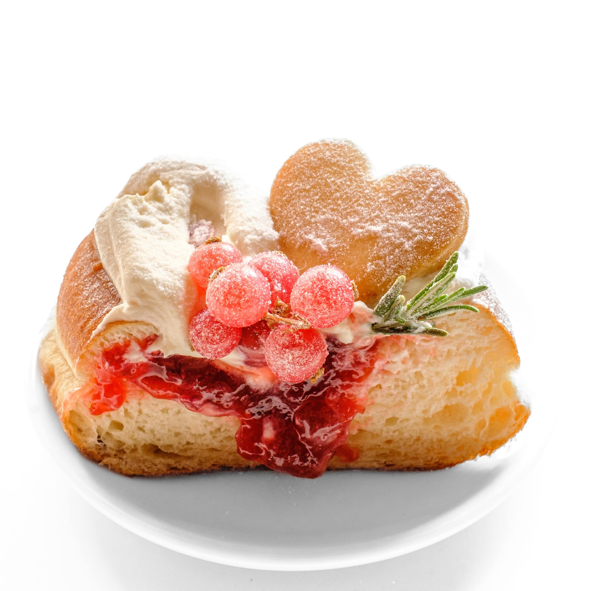 Koblihové srdíčko plněné lineckým rybízovým rozvarem a krémem z máslových sušenek zdobené lineckým cukrovím a čerstvým rybízem.