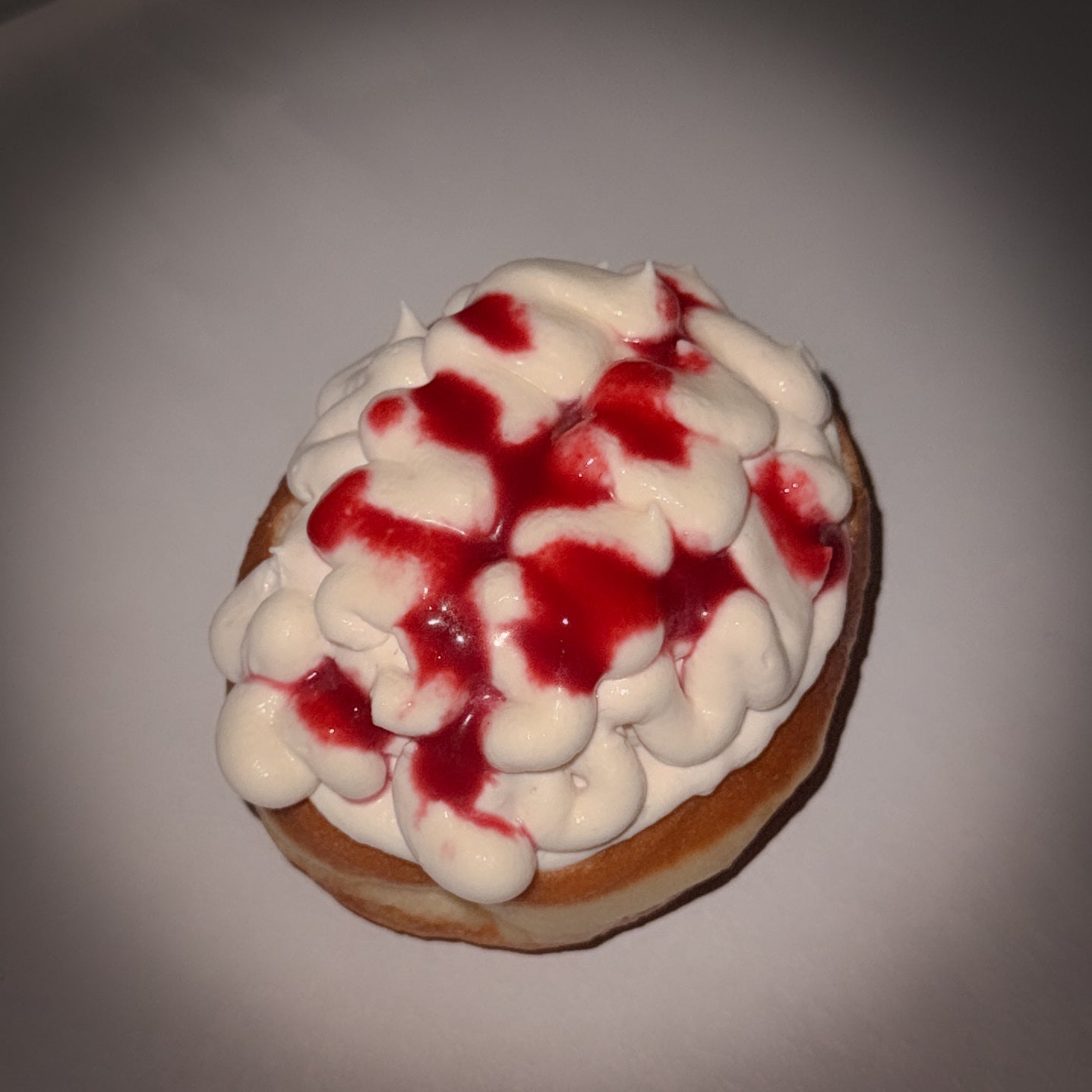 Kobliha plněná pistáciovým krémem zdobená malinovou šlehačkou a přelitá malinovým pyré.