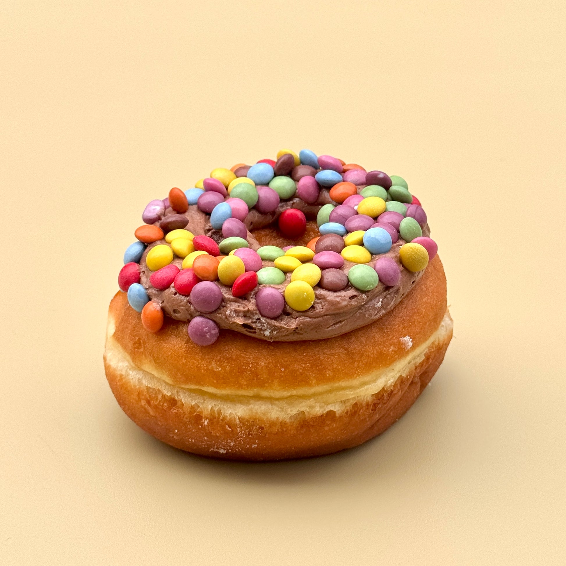 Donut zdobený vrstvou nutellového krému s mascarpone a mini lentilkami.
