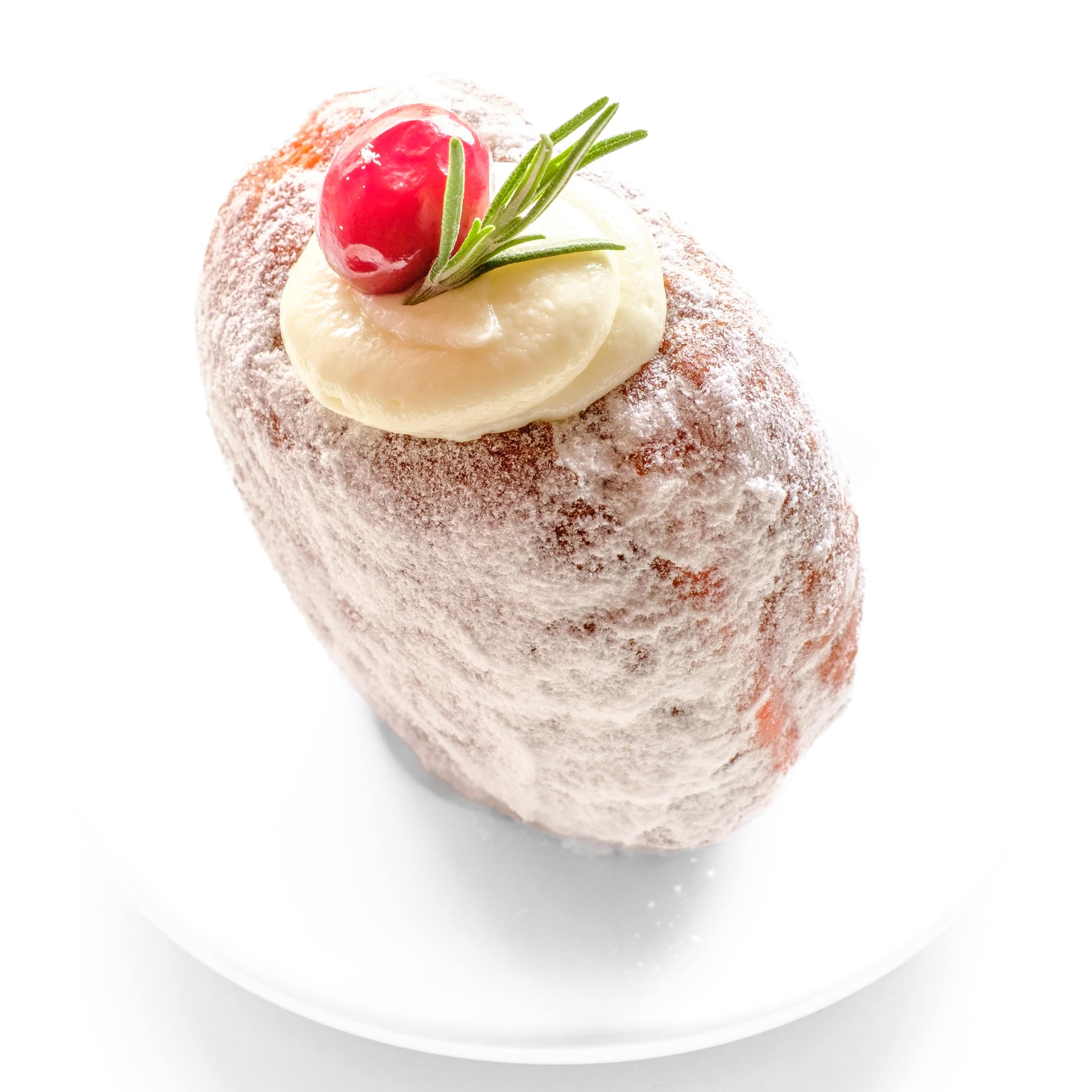 Kobliha z červeného těsta plněná sladkým cheesecakovým krémem zdobená čerstvou brusinkou.