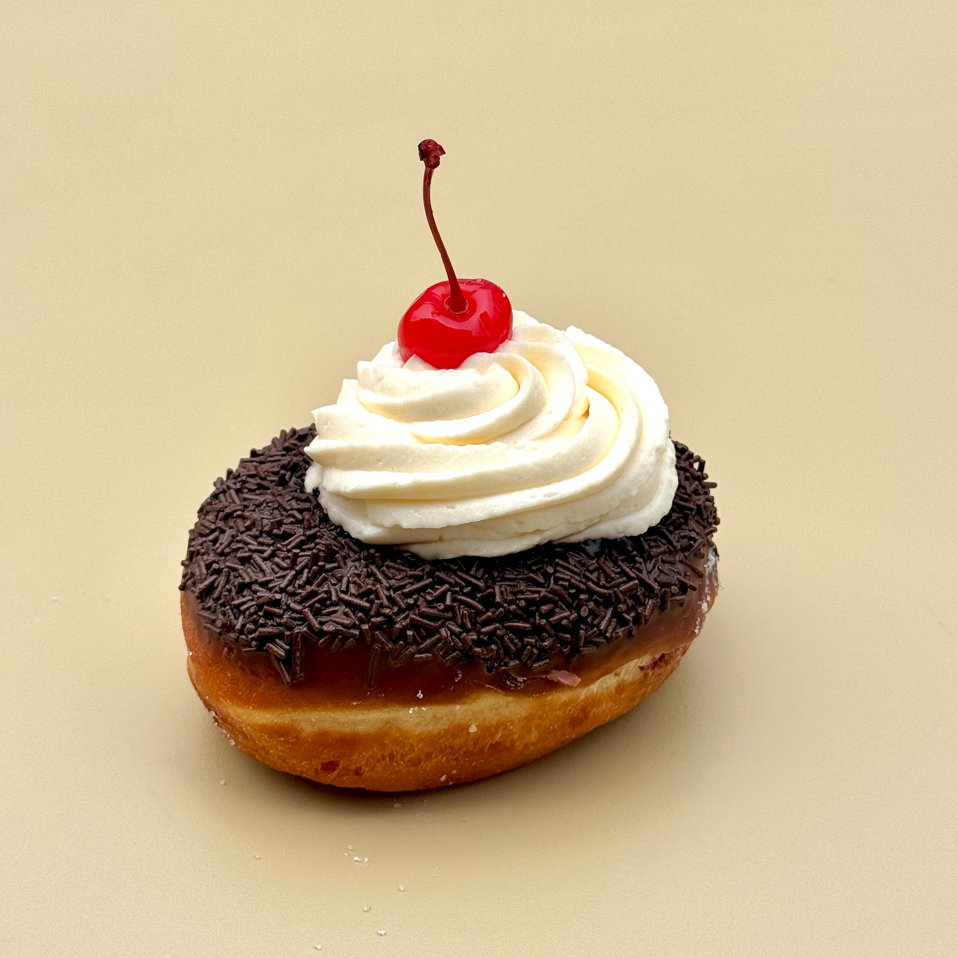 Kobliha plněná višňovým rozvarem s třešňovým likérem zdobená čokoládovou polevou a šlehačkou.