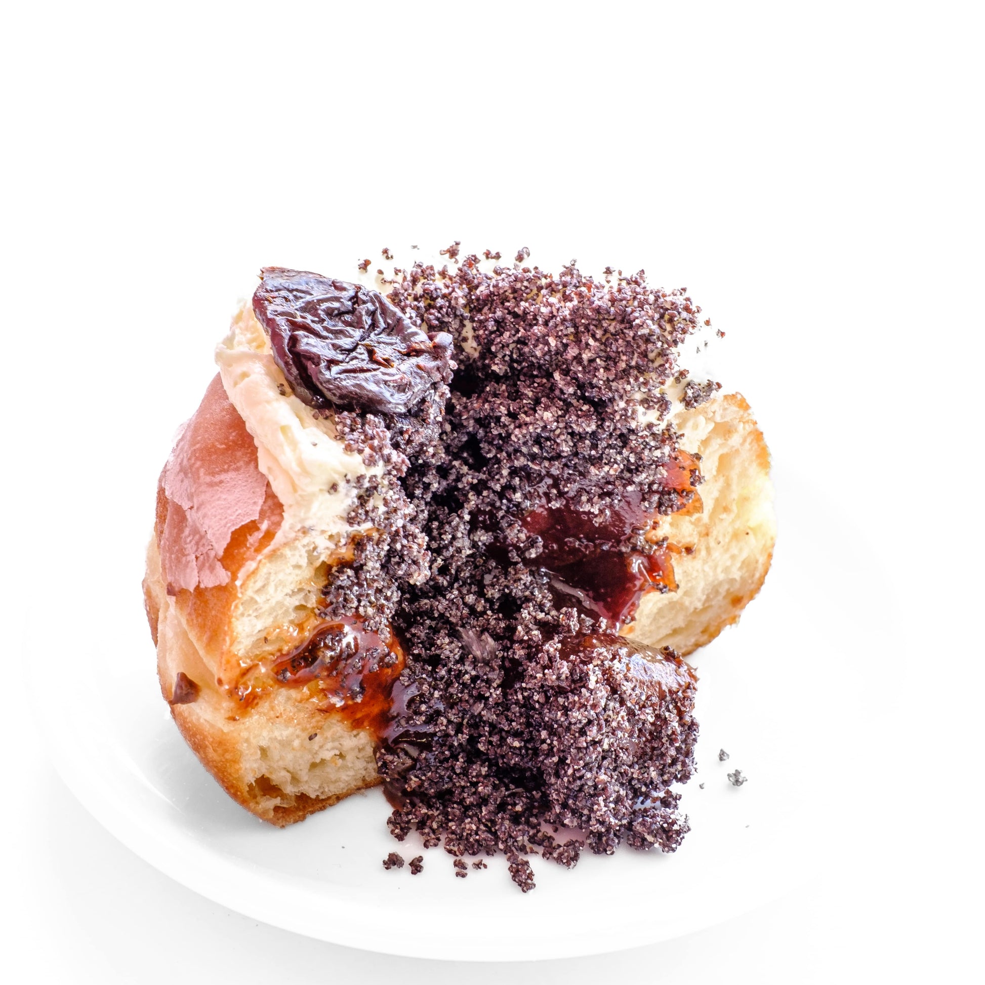 Kobliha s citronovou polevou plněná švestkovým rozvarem s povidly zdobená máslovým krémem, makovou drobenkou a sušenými švestkami.