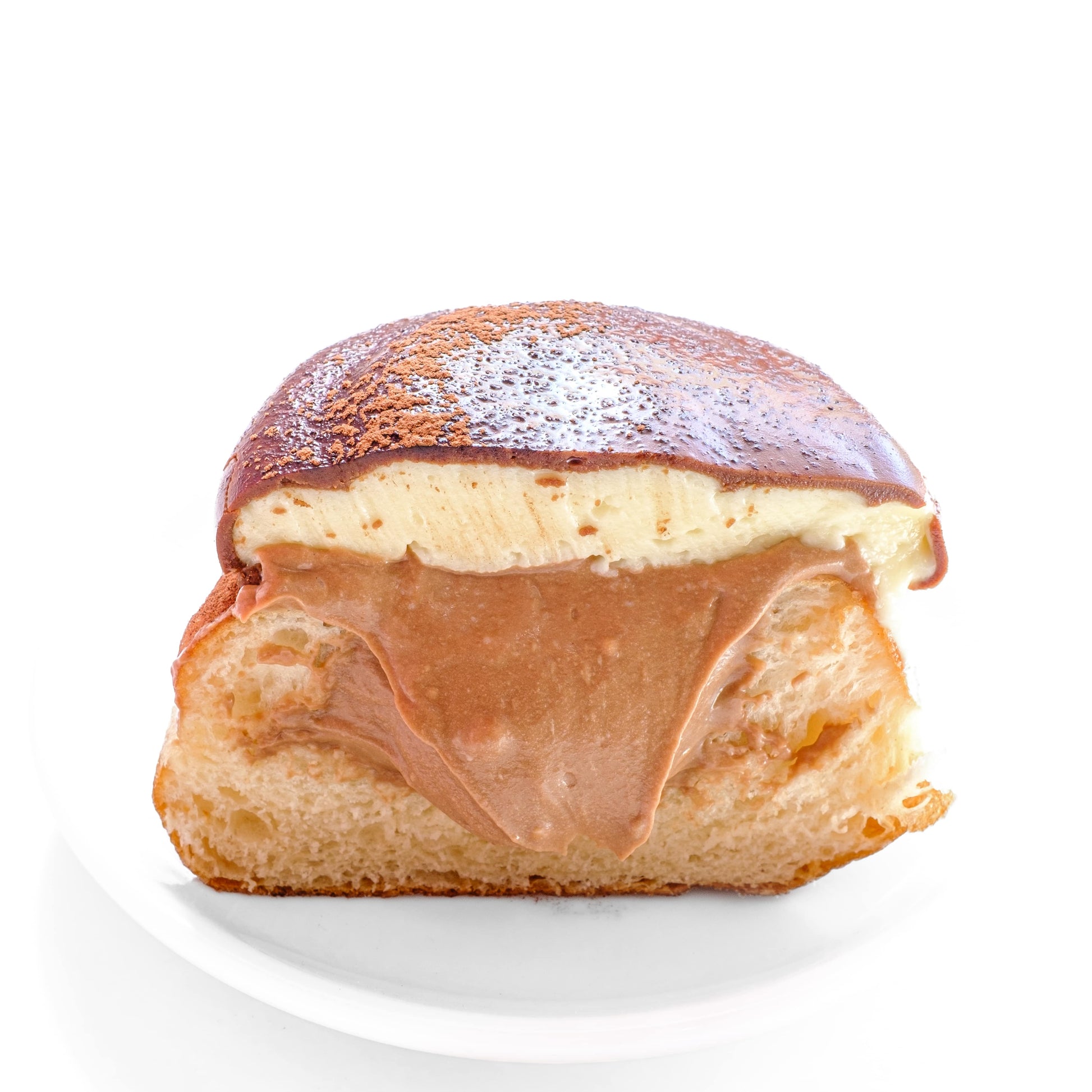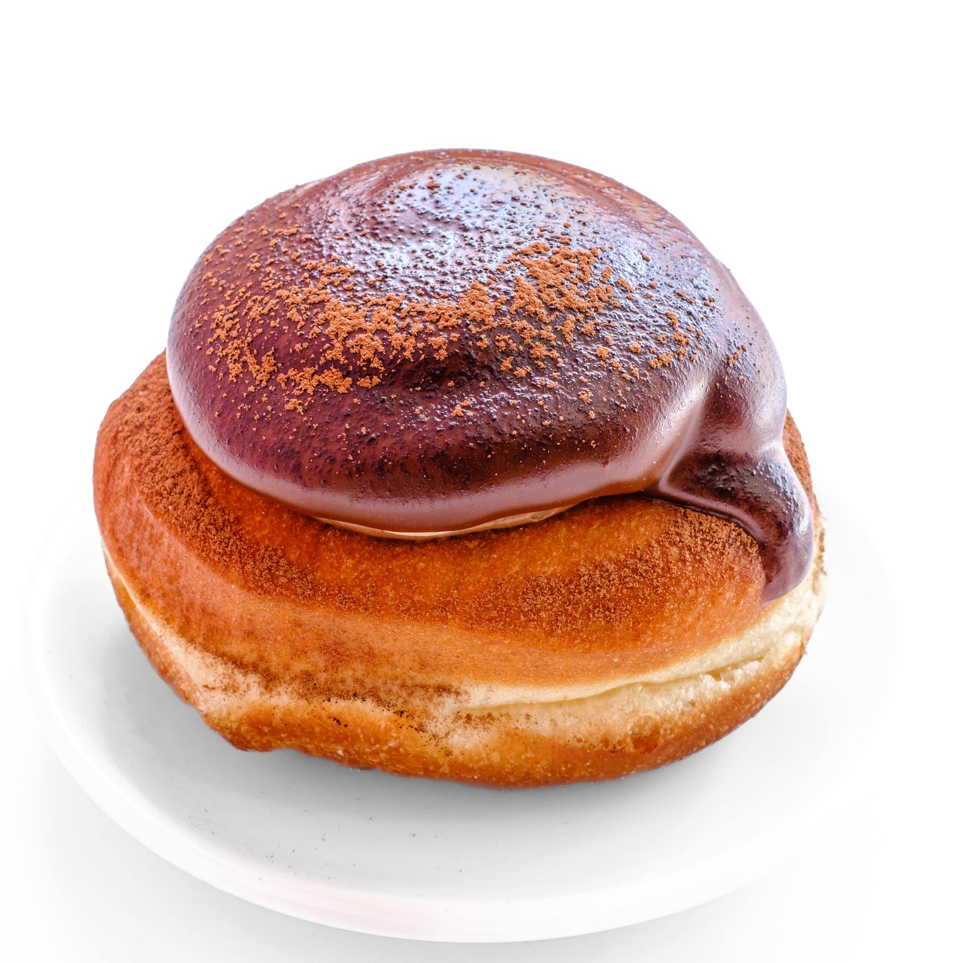 Kobliha plněná šlehanou ganache z hořké čokolády a krémem z bílé čokolády zdobená polevou z mléčné čokolády a kakaem.